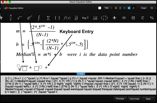 Daum Equation Editor for Mac: For the Mac, I purchased the Daum Equation Editor before it was free. I have used it to create graphic equation images that include Greek symbols, numbers and math symbols. These are typed into modular mathematical templates which can be combined to form a single, fairly complex equation. Created equations are often fairly large thus providing adequate quality when shrunk down to a size suitable for inclusion in text documents. The figure below shows the user interface .