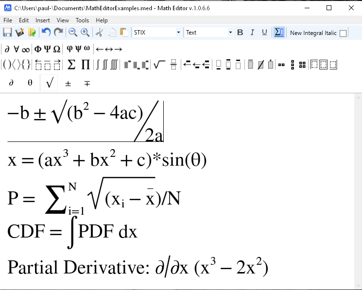 MathEditor: for PC is a "5 minute learn time" free Math Editor distributed under GNU General Public License version 3.0 (PGLv3) allowing both private and commercial use. It may be downloaded free from https://sourceforge.net/projects/eqtype/ and is available for Win32 PC based computers (also runs well on my Windows 10 based PC). The intuitive user interface is shown in Figure 5 along with example equations.