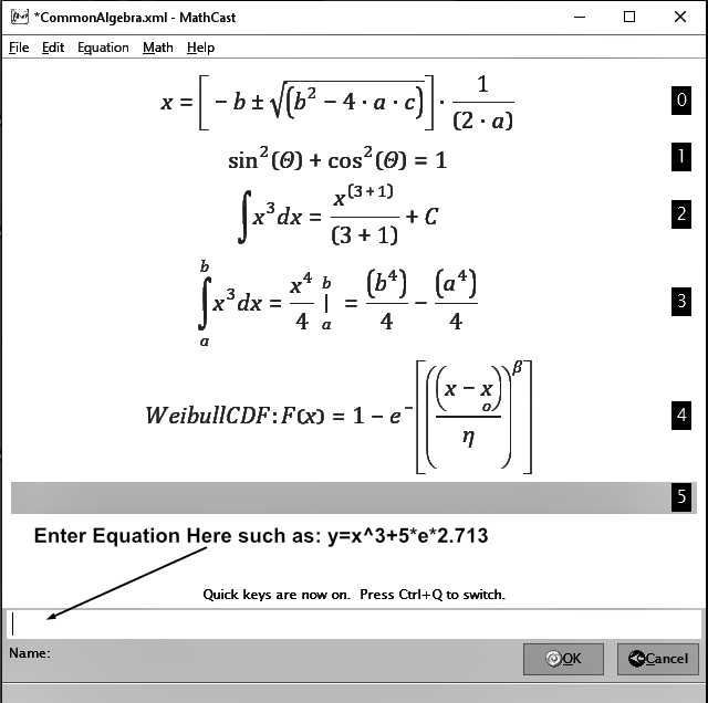 MathCast for PC is downloadable from multiple web-sites without cost including math.sourceforge.net. MathCast operation is simple, with a column of command buttons (not shown) at the left which enable creation of a new equation, saving of all equations etc. MathCast is released under GNU General Public License version 3.0 (GPLv3) allowing both private and commercial use.